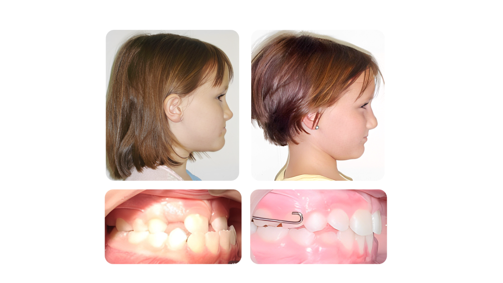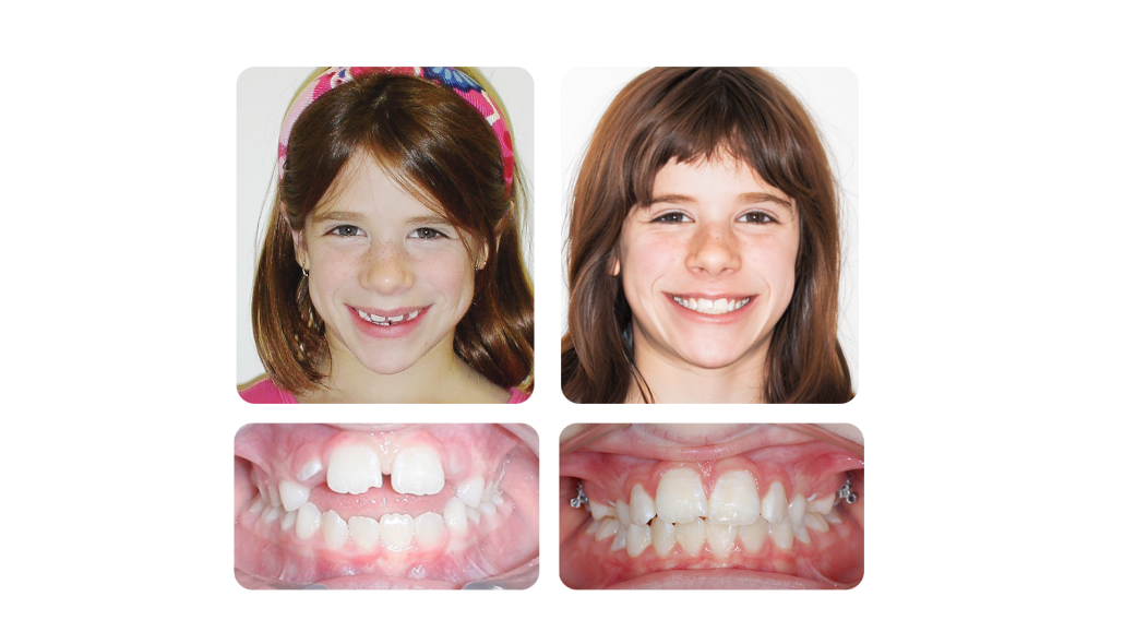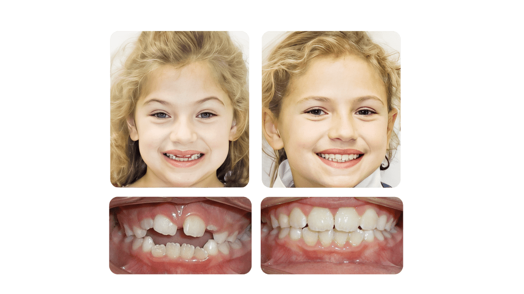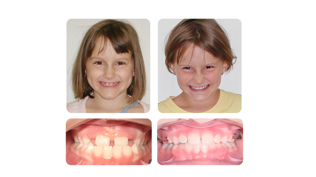 Sophie was treated with an expander and a reverse pull headgear. This corrected her anterior crossbite and provided her with an improved upper lip support (that can be noticed from the profile view) Her bite was also improved.