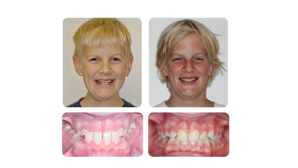 Alex had an interior crossbite, he was treated with a reverse headgear in conjunction with an expander. His anterior and posterior crossbites were corrected. His facial balance and harmony were improved.
